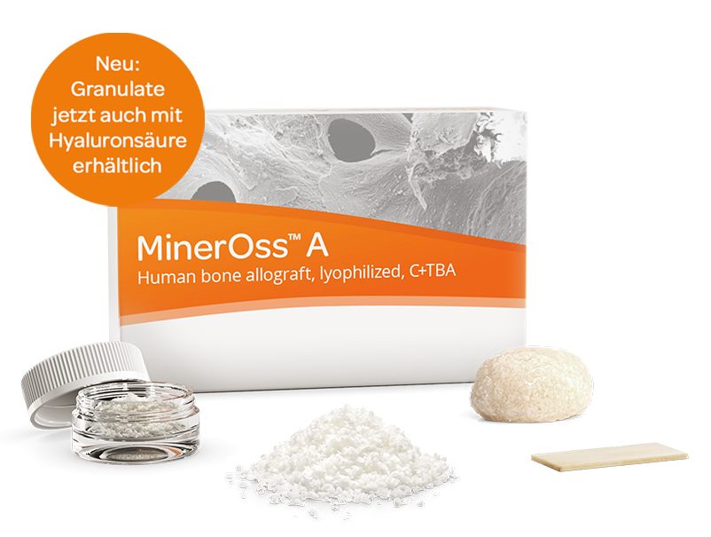 MinerOss A hingegen ist ein aus menschlichem Spenderknochen hergestelltes Allograft. Wissenschaftliche Studiendaten zeigen, dass Allografts in der Anwendung den patienteneigenen Knochen am ähnlichsten sind. Sie integrieren schnell und haben das Potenzial für ein Remodelling.1-5