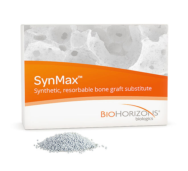 SynMax ist ein vollständig synthetisches, biokompatibles Material, das nach dem Einbringen als osseokonduktives Gerüst dient. Aufgrund der porösen Struktur wird das Einwachsen von mesenchymalen Stammzellen und Osteoprogenitorzellen aus dem umgebenden, vitalen Knochengewebe unterstützt. SynMax besteht zu 60 % aus Hydroxylapatit und zu 40 % aus Beta-Tricalciumphosphat, das nach der Implantation während des natürlichen Knochenumbauprozesses (Remodelling) kontrolliert resorbiert und durch neue Knochensubstanz ersetzt wird.