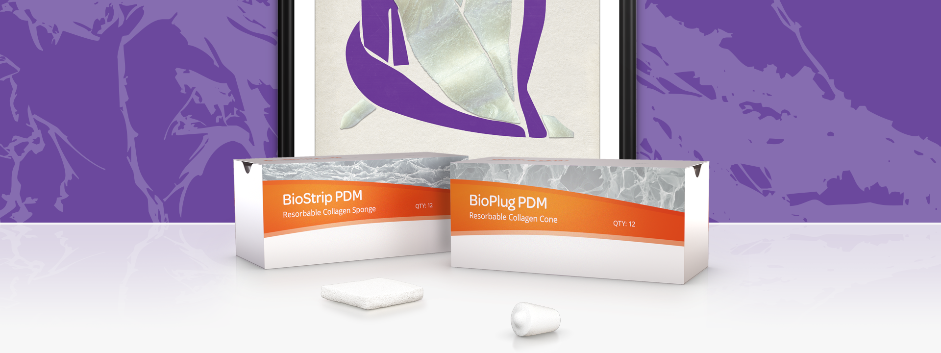 Als Ergänzung zu den Knochenersatzmaterialien und Membranen sind die Kollagen-Wundauflagen BioPlug PDM und BioStrip PDM im Sortiment der Regenerationsmaterialien enthalten. Die Wundauflagen porcinen Ursprungs unterstützen die körpereigene Kollagensynthese und absorbieren Blut und andere Flüssigkeiten zum Schutz behandelter Stellen. Sie sorgen für eine beschleunigte Granulation und Epithelisierung und für eine gute Regeneration des Operationssitus. BioStrip PDM wird zum Verschluss transplantierter Stellen und zur Abdeckung kleiner Wunden eingesetzt. Der Kollagenkegel BioPlug PDM findet Anwendung im Verschluss von Extraktionsalveolen und Biopsie-Entnahmestellen. Die Wundauflagen sind in zwei bis vier Wochen vollständig resorbiert.