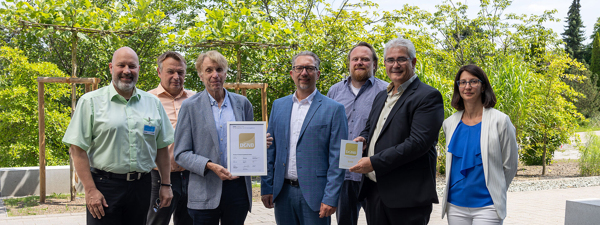 Bildunterschrift „Übergabe“: „Offizielle Übergabe des Gold-Zertifikates der DGNB an die ALTATEC GmbH.“
