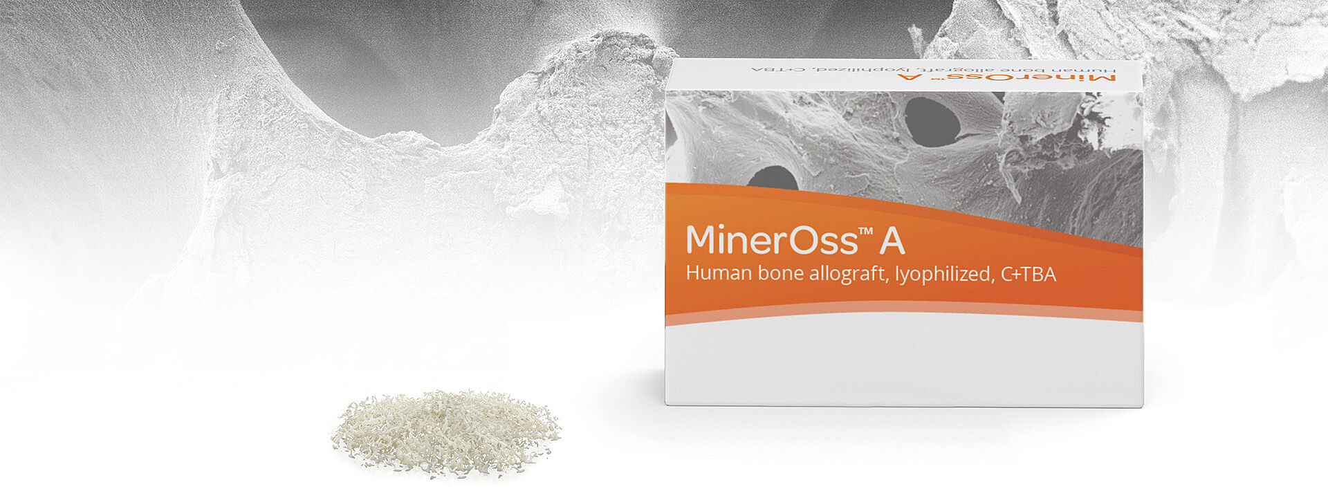 MinerOss® A ist ein aus menschlichem Spenderknochen hergestelltes Allograft und ist eine allogene Alternative zu autologen Transplantaten. Der humane Spenderknochen wird von der Cells+Tissuebank Austria (C+TBA) nach einem stringenten serologischen Screening-Protokoll in einem mehrstufigen Reinigungsprozess für die sichere Anwendung verarbeitet. MinerOss® A ermöglicht zuverlässige und vorhersagbare Ergebnisse zur Regeneration von Knochendefekten. Durch die natürliche Zusammensetzung des Knochens weist das allogene Biomaterial eine hohe biologische Regenerationsfähigkeit mit einem natürlichen Remodelling-Verhalten auf und unterstützt den kontrollierten Gewebeumbau durch die osteokonduktiven Eigenschaften.4 Es ist als spongiöses und kortikospongiöses Granulat, Block sowie kortikale Platte erhältlich und findet Anwendung bei Techniken zur gesteuerten Knochenrekonstruktion (GBR) im Kiefer.