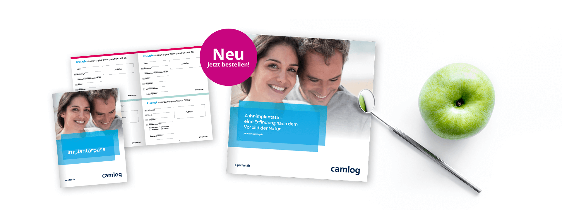 Diese Medien sind wie gewohnt kostenlos. Gerne können die Patienteninformationsmaterialien sowie der Stempel per Fax 0800 9445-000, Telefon 07044 9445-100 oder E-Mail order.de@camlog.com bestellt werden.