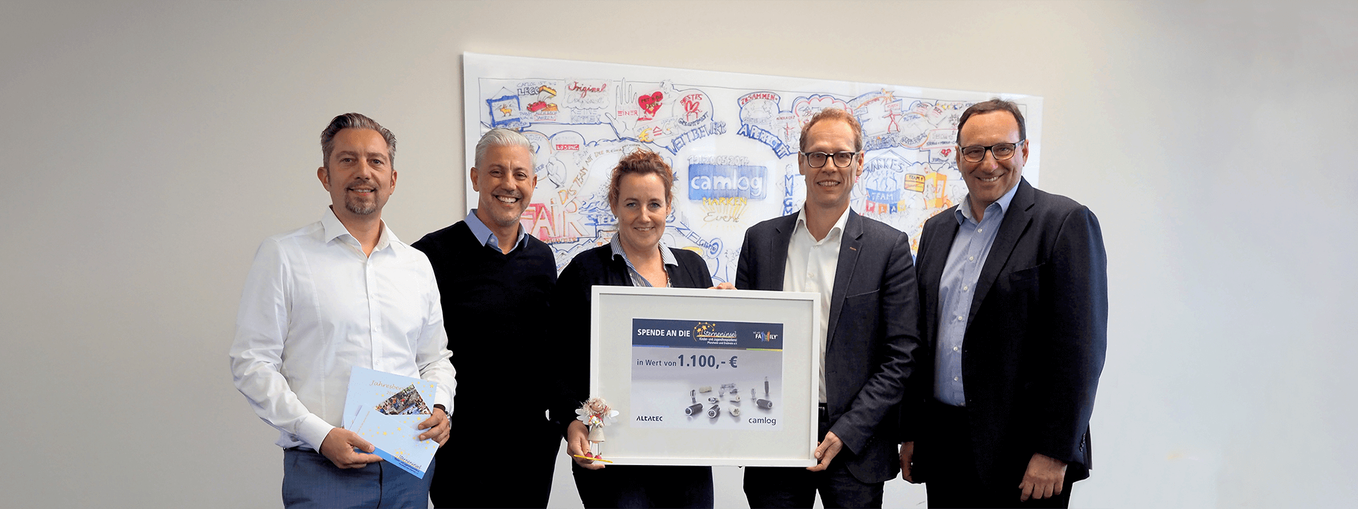 Die Scheckübergabe hat am 9. Oktober mit Kerstin Schiwy von der Sterneninsel und der Geschäftsleitung von CAMLOG und ALTATEC stattgefunden.